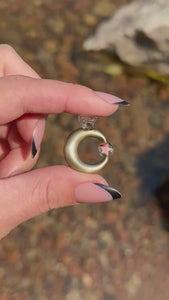 Kinetic spinning opal ball trapped between two points of the crescent. Made with original Molten Aura Electrum. Crushed opal bail.